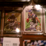 Christian Ponder showed up around 7:30, and despite his recent downturn in production on the field, everyone there (now about 200+ people) were happy to see him. Because I had so much Ponder stuff already, including some items from last year’s customer night, I wasn’t as willing to fight the line. People were getting pushy, mainly because there were a few players now signing, and quarters were tight, but I managed to get up to the front after a while and get my card and photo signed.