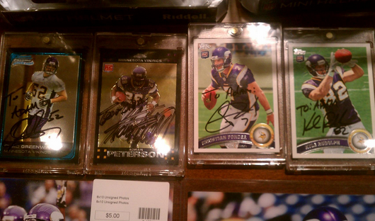 Then it got nuts. Buzz was starting to go around that Adrian Peterson was going to show up (unannounced), and when he walked in the door, it was like black Friday doorusters to get back to the place where they thought he was going to be. I staked out a less likely spot where I thought he would be, and much to my surprise, he was stationed just a few feet down the counter. Obviously, this caused a tidal wave of people to pack into this other corner of the store, with me about 10 people back. The event was scheduled to end at 9pm, and it was already 8:20, so Peterson would have limited time to sign the massive amounts of autographs everyone wanted.
