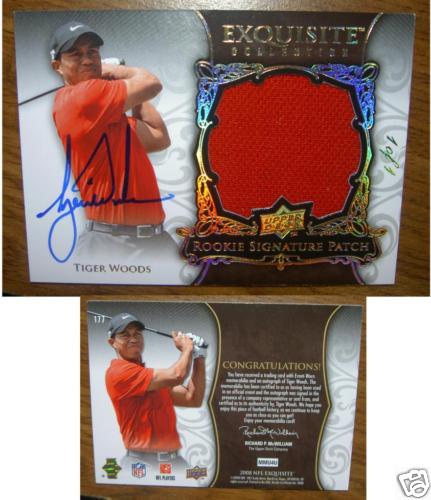 Now that we have confirmed auctions of the Tiger Woods exquisite patch auto, many of our questions have been answered. Im actually very glad that this card has finally surfaced, as without it, UD has been in a pretty precarious situtation with the people who already had a hard on for the agony of the people over in Carlsbad.